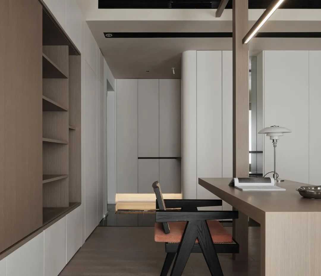 全屋柜體設計同樣貼合侘寂理念:衣柜采用無拉手反彈器設計,保留木材天然紋理與自然瑕疵;儲物柜以不規則格子布局滿足多元收納需求;餐邊柜融入藤編元素與暖光內置燈,在實用功能中注入自然氣息。整套產品通過統一花色與材質搭配,實現木門、衣柜、餐邊柜、護墻板的風格協同,構建沉浸式侘寂空間。