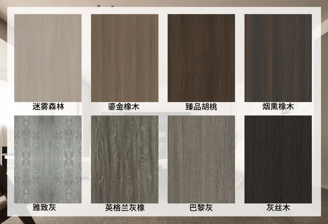 品橋此次推出的侘寂風系列覆蓋木門、柜體、護墻板等全屋定制產品,精選多款適配花色打造統一美學體系。木門方面,【雅致灰】以水泥質感花紋還原質樸本色,【英格蘭灰橡】【巴黎灰】則將黑灰色調與實木紋理自然融合,搭配簡約平板造型與黑色拉手,盡顯純粹質感;【迷霧森林】【臻品胡桃】等深色系產品,憑借厚重木紋傳遞時光沉淀的韻味,為空間增添敘事感。