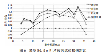 6 、實驗效果 為驗證風電葉片疲勞試驗損傷實時評估系統(tǒng)的 準確性,對某型 56.5 m 葉片疲勞加載試驗的損傷分 別進行實時處理和后處理,兩者結果對比如圖 6 所 示,圖 6 中 PS 面為葉片迎風面,水平固定時朝上,SS 面為背風面,水平固定時朝下。可看出,實時處理的結 果和后處理的結果基本吻合,但各截面實時處理的結 果普遍比后者偏高 2%左右。這是由于進行后處理時, 為了提高程序運行效率,對彎矩峰峰值小于額定值 80%的數據進行了舍棄,而實時評估系統(tǒng)則考慮了所 有載荷造成的損傷。