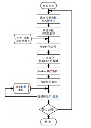 5、葉片疲勞損傷實時評估軟件程序設計 采用“生產者-消費者”設計模式來實現載荷數據 的在線處理。通過 LabVIEW 和某型動態(tài)應變儀的上 位機軟件共享物理內存來獲得應變數據,存儲在緩沖 區(qū)中。數據處理程序每隔一定時長從緩沖區(qū)中讀取數 據并進行損傷計算,并將結果寫入數據庫。若主要截 面有 12 個,應變儀采樣頻率為 50Hz,數據處理程序 每隔 10 s 讀取一次數據,則單次需要處理的數據量 為 6 000 個,處理時間 t < 1 s,不會造成緩沖區(qū)溢出。 軟件實現流程如圖 5 所示。